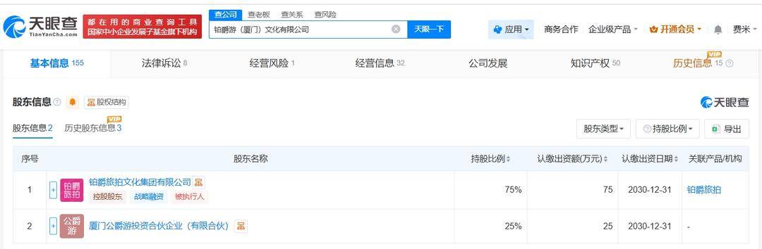 据悉,铂爵游(厦门)文化有限公司成立于2020年3月,注册资本100万人民币,经营范围包括组织文化艺术交流活动、摄影扩印服务、摄像及视频制作服务等。股东信息显示,该公司由铂爵旅拍文化集团有限公司、厦门公爵游投资合伙企业(有限合伙)共同持股。