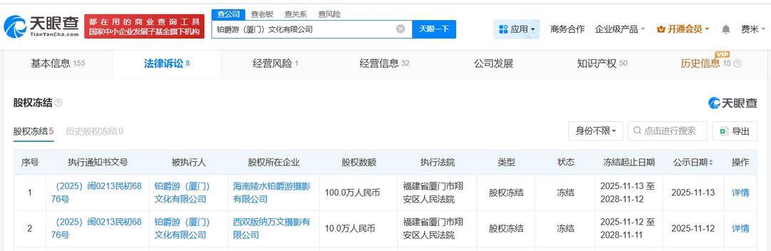 近日,铂爵游(厦门)文化有限公司新增两则股权冻结信息,据天眼查天眼风险信息显示,股权所在企业分别为海南陵水铂爵游摄影有限公司、西双版纳万文摄影有限公司,冻结股权数额合计110万人民币,冻结期限均为3年,执行法院均为福建省厦门市翔安区人民法院。